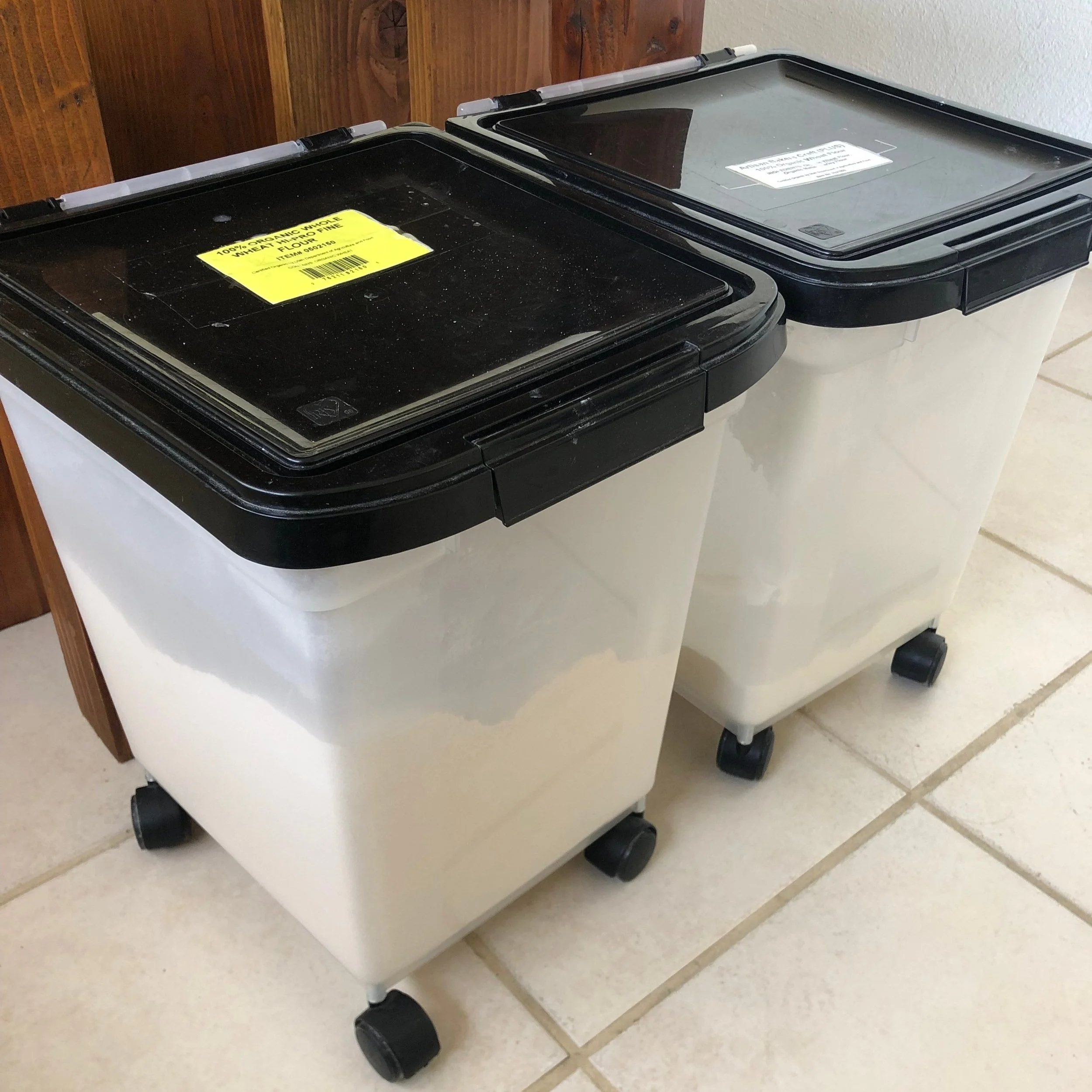 These containers hold up to 25 lbs of flour and are on wheels for easy portability around my kitchen. They are air tight and a great way to store larger quantities of flour.