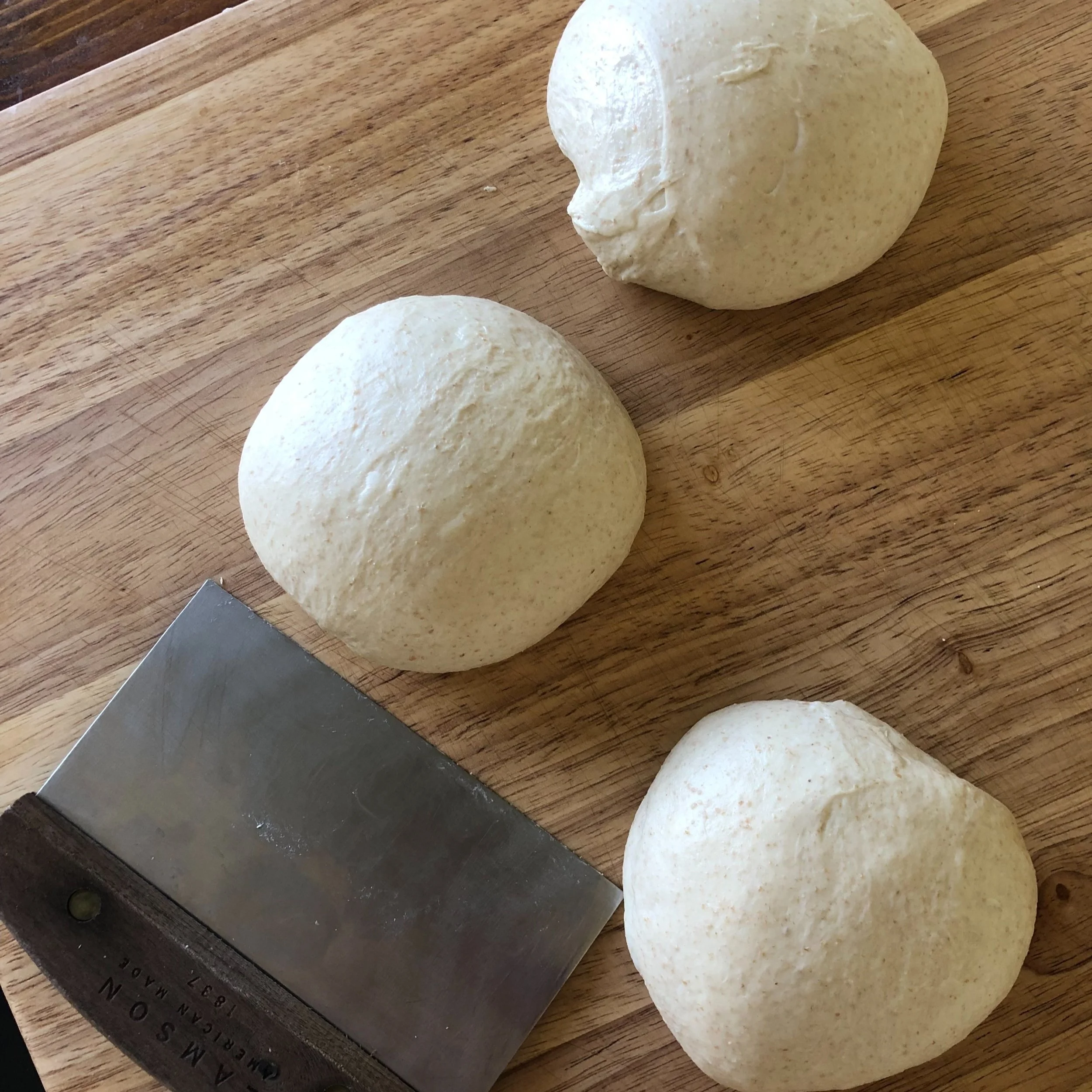 Using a bench scraper gently divide the dough into two equal pieces; use the scale to weigh each piece to be approximately 445 grams.