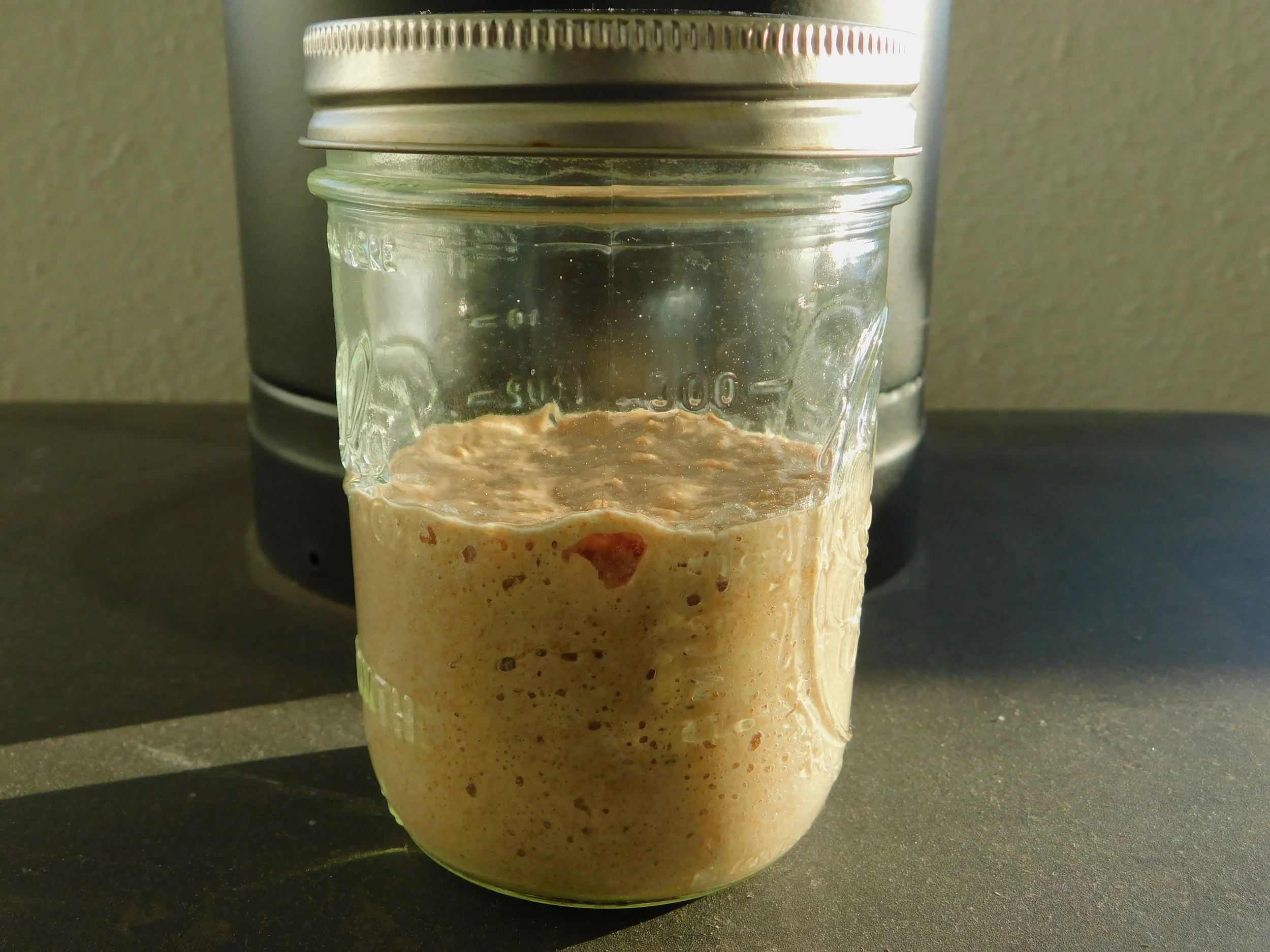Mix a ratio of 1 : 10 : 10 so, 10 grams starter : 100 grams water : 100 grams whole wheat flour. Ensure the ingredients are thoroughly mixed in the jar.