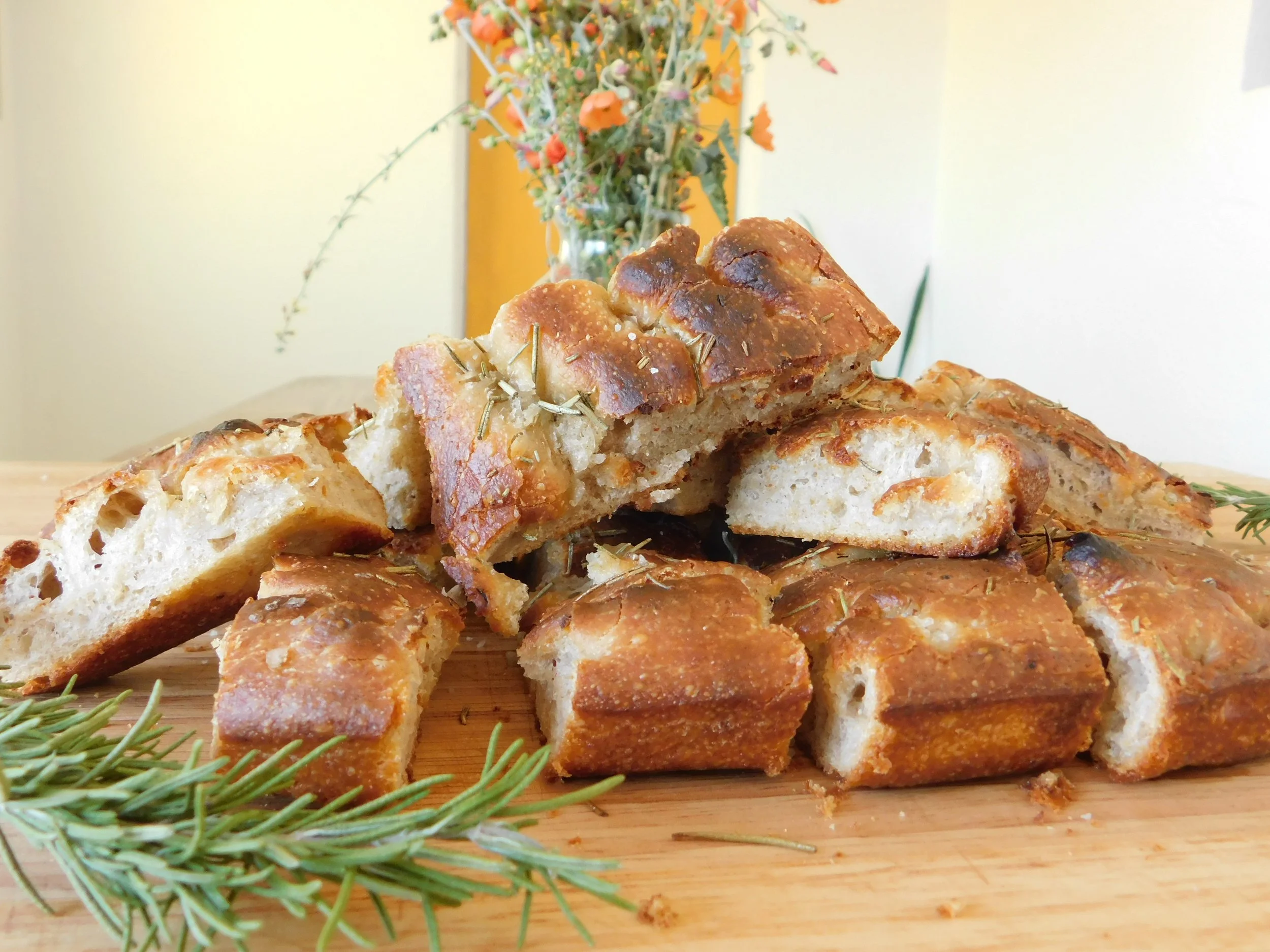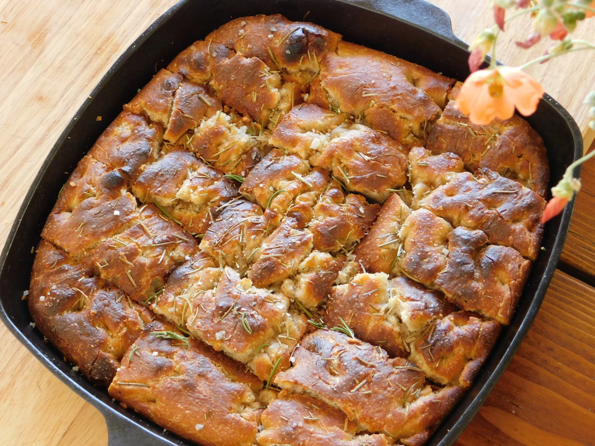 Bake in the oven for 30 minutes or until desired golden color. The focaccia should pop right out of the pan once the bottom is a crisped. Allow the focaccia to cool in the pan before slicing. Enjoy!