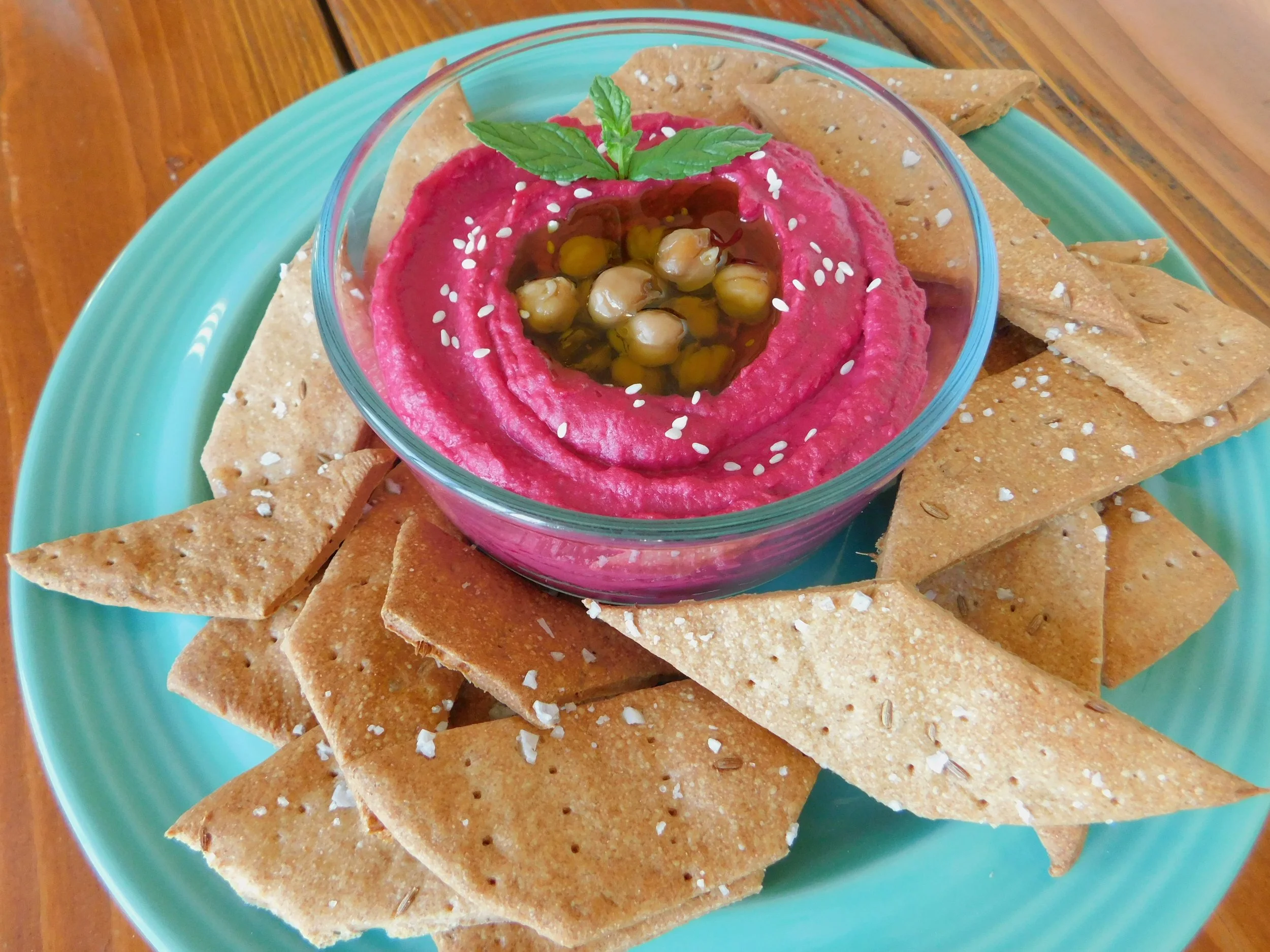 Salted Cumin Seed Crackers with Roasted Red Beet Hummus